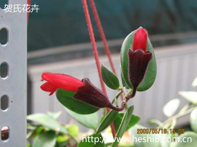 【形态特征】为附生性常绿蔓生草本植物。叶对生,卵形,革质而稍带肉质,长4.5cm,宽3cm,全缘,中脉明显,侧脉隐藏不显,叶面浓绿色,背浅绿色。花腋生或顶生成簇,花冠红色至红橙色,长约6.5cm。花萼筒状,黑紫色被绒毛,待长至约2cm时,花冠才从萼口长出,筒状,鲜艳红色,如同口红一般故名。