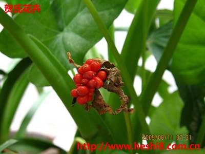 【形态特征】直立草本,地上茎有时高达2—3米,全株最高可达5米。匍匐根状茎粗5—8厘米,圆柱形,有节,常生不定芽条。叶多数,螺旋状排列;叶柄粗大,长可达1.5米、下部1/2具鞘,基部连鞘宽5—10厘米;叶片革质,表面稍光亮,绿色,背较淡,极宽,箭状卵形,边缘浅波状,长50—90厘米,宽40—80厘米,前裂片宽卵形,先端渐尖,长宽几相等,后裂片半卵形;长约为前裂片的1/3,基部联合较短,弯缺圆形,后基脉互父成直角或锐角;前裂片Ⅰ级侧脉6-10对,略宽。花序柄2—3 丛生,圆柱形,各被以长50厘米,宽约8厘米的苞叶(鳞叶),后者披针形,绿色;花序柄长(12-)50—60厘米,淡绿色。佛焰苞管部席卷成长圆状卵形或卵形,白绿色,长3—5厘米,粗4厘米;檐部白绿色、黄绿色,后变白色,舟状,长圆形,先端稍突尖,略下弯,长(10-)20—30厘米,展开宽(4 -)5—8厘米。肉穗花序芳香:雌花序圆柱形,长(2-)3—4厘米,不育雄花序长(2.5-)5—6厘米,渐狭过渡为能育雄花序,后者长3—7厘米;附属器圆锥状,奶黄色,基部较粗,长3—5.5厘米,粗1—2厘米,先端钝,嵌以不规则的槽纹。雌花:子房棱柱状,先端渐狭为明显的花柱,柱头盘状,胚珠卵形,基底胚座。不育雄花扁平,顶部六角形。浆果亮红色,短卵状,长约1厘米,径5—9毫米。花期4-7月。