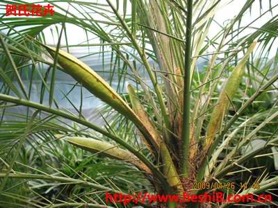 【形态特征】针葵为常绿灌木,茎短粗,通常单生,亦有丛生,株高1-3米。叶羽片状,初生时直立,稍长后稍弯曲下垂,叶柄基部两侧有长刺,且有三角形突起,这是其特征之一;小叶披针形,长约20-30厘米、宽约1厘米,较软柔,并垂成弧形。肉穗花序腋生,长20-50厘米,雌雄异株。果长约1.5厘米,初时淡绿色,成熟 时枣红色。